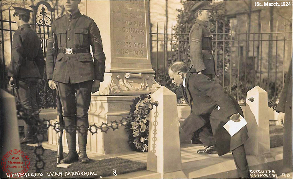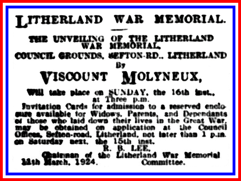 Suggestions included a victory hall comprising of a hall, library, newsroom and swimming baths. The War Memorial Committee was asked to reconsider in the light of the suggestions and cost which would have to be funded. Funding of such a grand memorial delayed the construction until 1924 when a more practical plan for the memorial was approved - Mr Robert Baxter Lee was the Chairman of the Litherland War Memorial Committee. The sum of £600 was raised for the erection of the memorial -