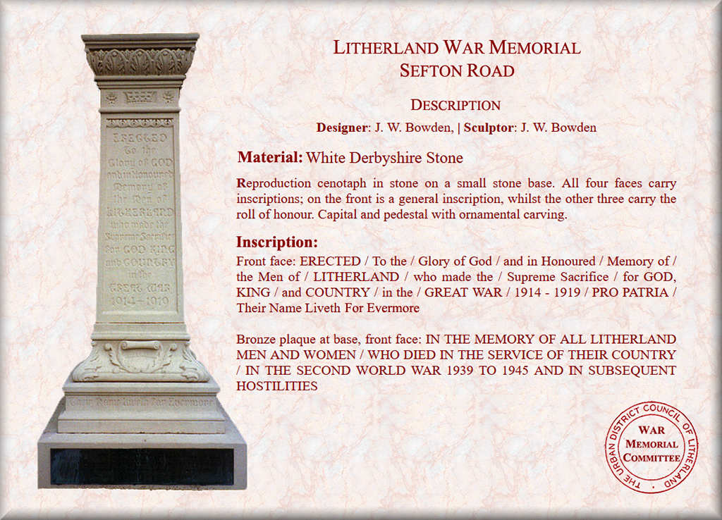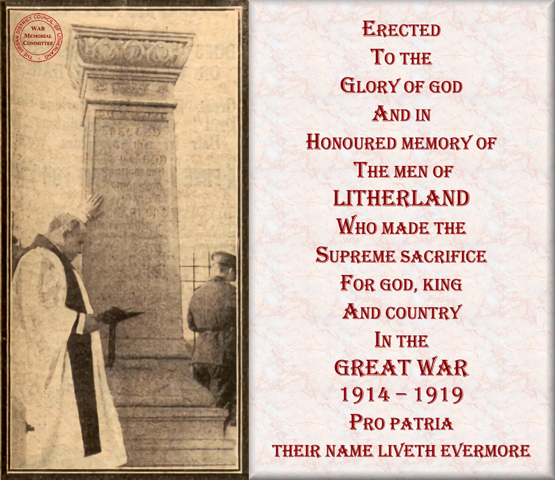 In 1917 the matter of erecting a 'War Memorial' in Litherland was first discussed at a 'Council Meeting' a resolusion was past that the council should look into the matter. In January 1919 the War Memorial Committee proposed the construction of the 'Litherland War Heroes Hall' on the corner of Bridge Road and Linacre Road. A public meeting was held to put forward further ideas on the form of the memorial.